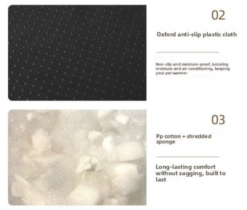 The soft fleece sleeping surface provides warmth and comfort, while the waterproof Oxford cloth exterior protects against spills, accidents, and moisture. Filled with PP cotton and crushed sponge, the bed offers excellent cushioning and joint support, making it ideal for daily rest, lounging, and deep sleep.