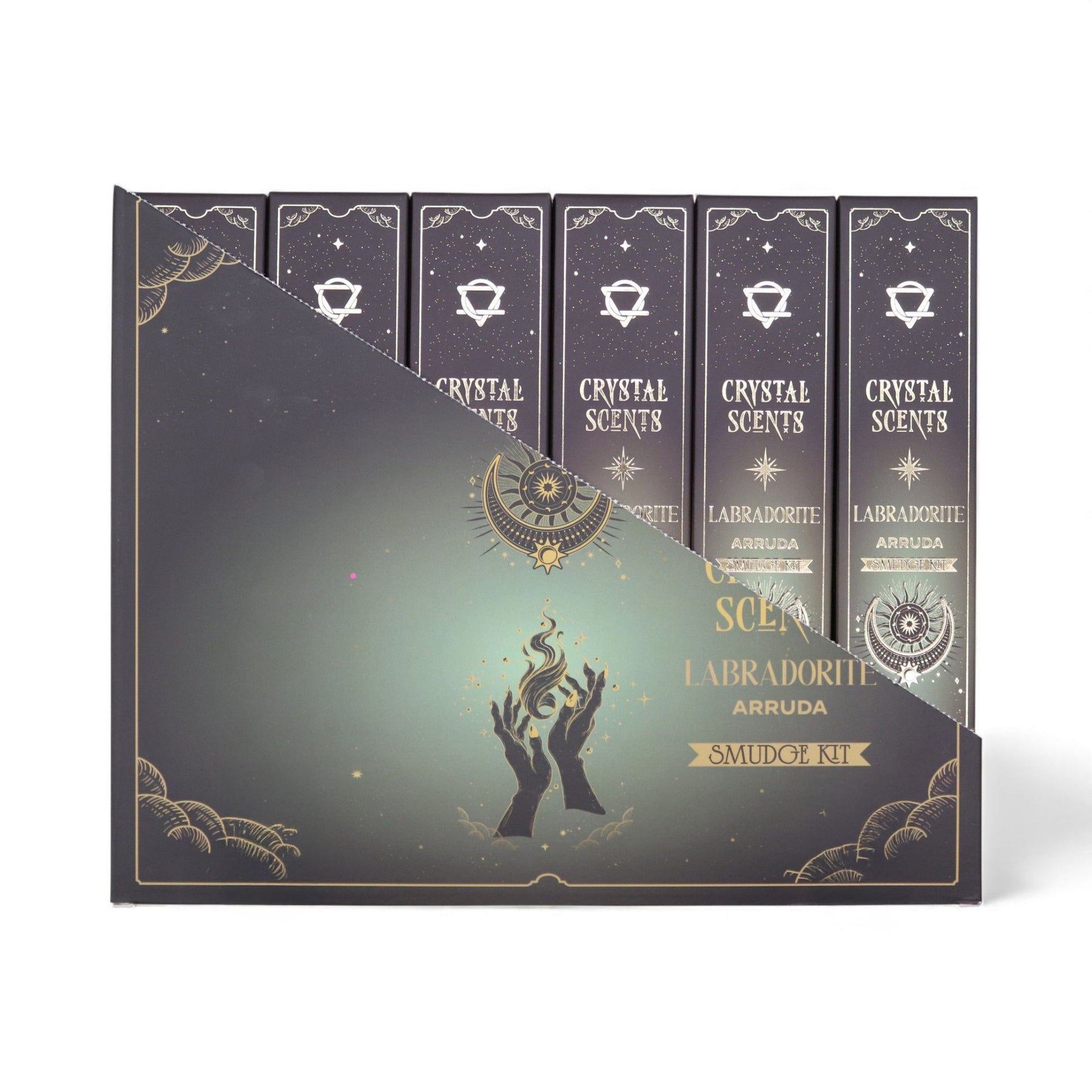 A small bag of real labradorite chips adds a subtle, mystical touch — ideal for anyone who enjoys crystal keepsakes or mindful rituals at home. The sticks arrive wrapped in printed protective paper and presented in a deep green celestial-style cardboard sleeve with intricate artwork.